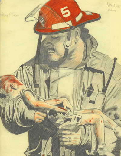 After the Oklahoma bombing, Time came out with a book full of photos relating to it. This was one of the more famous ones to come out of a firefighter holding a severly injured baby Bailey. Normally I don't use colour when I pencil, but this turned out to be a bit of an experiment for me as well as a way to cope with the newest sensless tragedy to plague the free world. Shortly after I did this, the child's mother made a statement that she wanted to stop this photo from circulating as it only served to remind her of the pain of losing her baby, and so I wrapped it up and left it there for 10 years. This is the first time it has been out since.